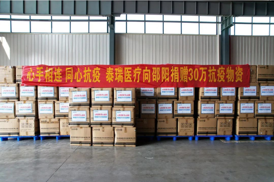守望相助,心系邵陽!泰瑞董事長作為邵陽隆回人,時刻關注著家鄉的疫情防控情況,在了解到邵陽多地疫情較嚴重、口罩等物資緊缺后,緊急籌備140萬口罩防疫物資,分批發往邵陽隆回等地,向“疫”而行,助力當地疫情防控。